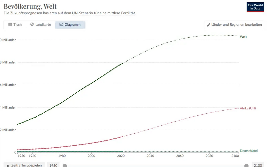 In weniger als 30 Jahren werden allein in Afrika eine Milliarde Menschen da- zukommen. Damit werden auf diesem Kontient 17-mal mehr Menschen neu geboren als derzeit in Deutschland leben. Insgesamt leben in Afrika dann 2,3 Milliarden, in Euro 740 Millionen. In Asien werden es in derselben Zeit "nur"weitere 600 Millionen dazukommen. So steigt die Weltbevölkerung auf 10 Milliarden. Damit hat sie sich in 150 Jahren versechsfacht. Allein deshalb ist jeder Versuch Deutschlands, das Klima im Alleingang retten zu wollen, zum Scheitern verurteilt.